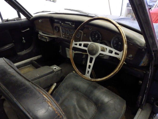 Inside the interior doesn’t look too bad but will obviously require restoration. There’s wear to the steering wheel and a split in the drivers seat but these are repairable. It’s hard to tell but it does look like the passengers seat cushion is missing. All the dials, switches and radio appear to be intact and the wooden dash seems to be in good condition and should polish up nicely.
